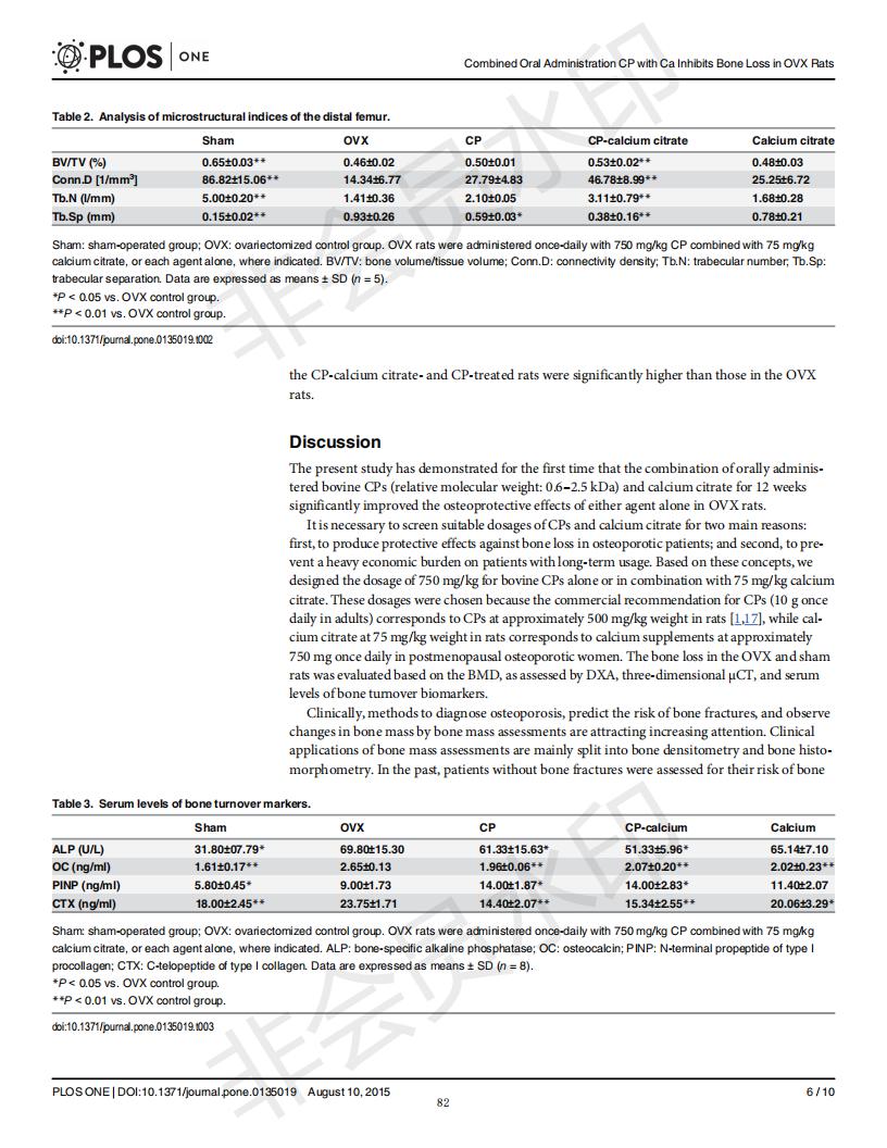 Oral administration of collagen peptide and calcium citrate inhibits bone loss in ovariectomized rat