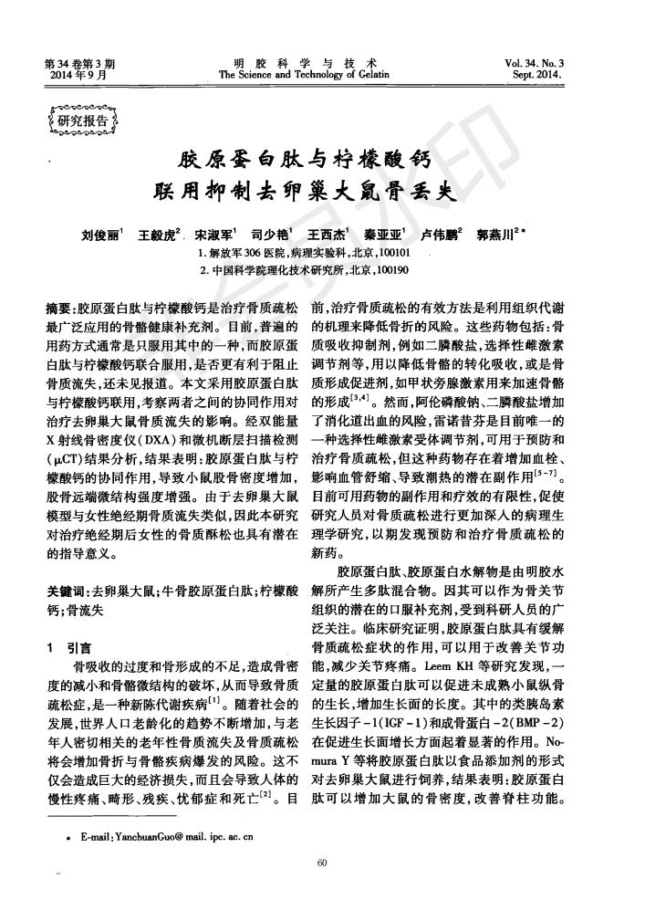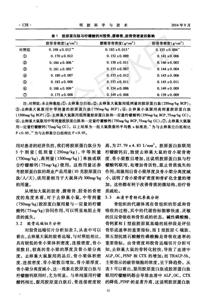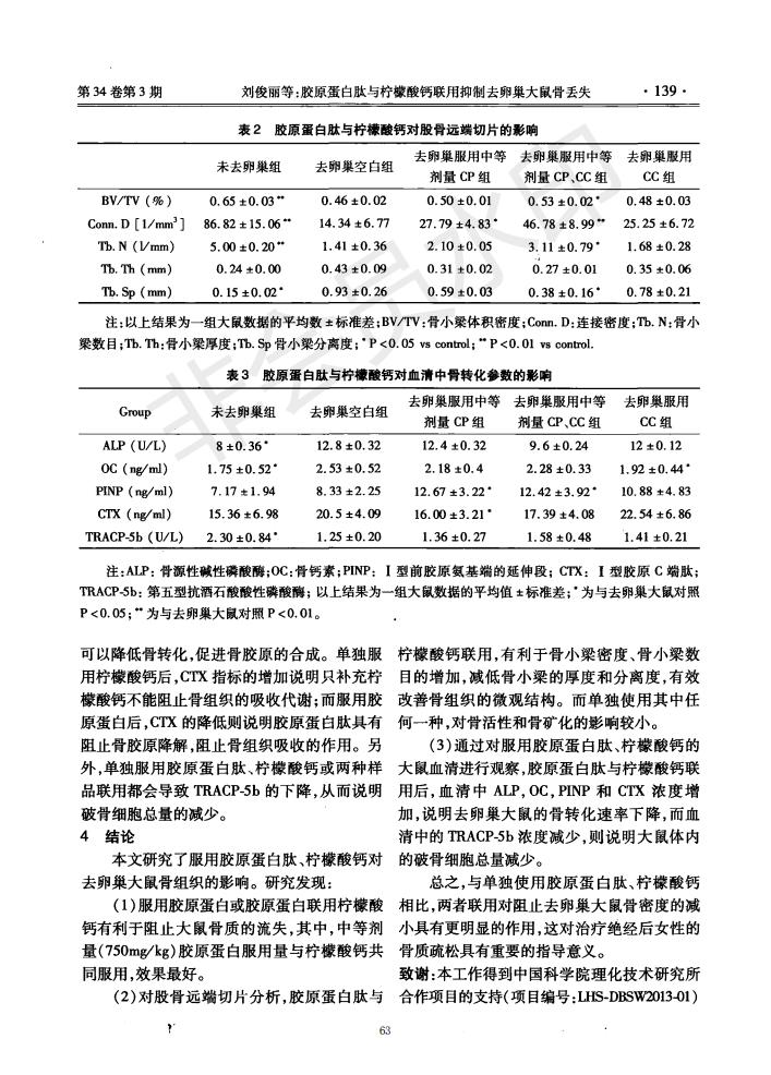 膠原蛋白肽與檸檬酸鈣聯用抑制去卵巢大鼠骨丟失