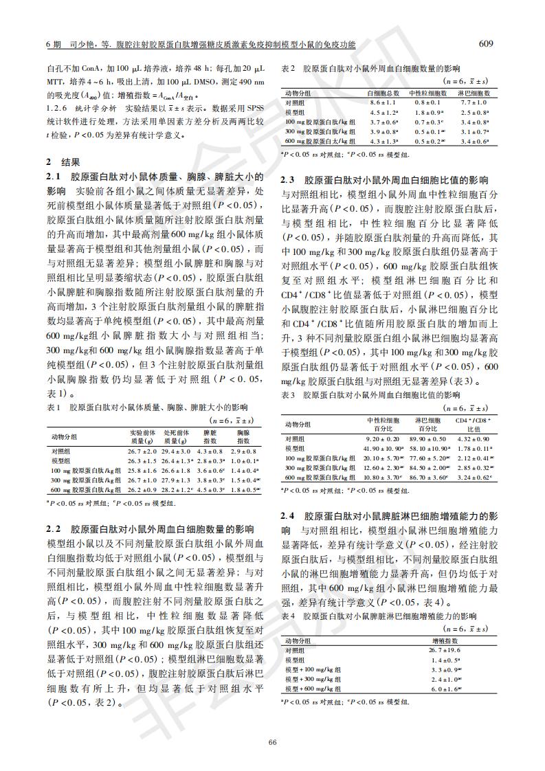 腹腔注射膠原蛋白肽增強糖皮質激素免疫抑制模型小鼠的免疫功能