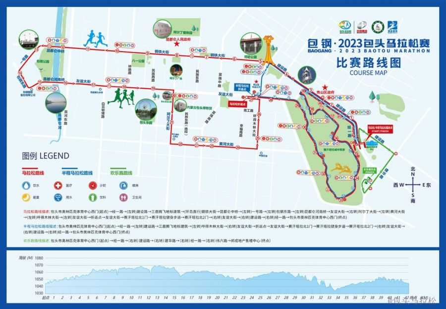 圓素提示:包頭馬拉松賽將于6月23日7點(diǎn)30分開(kāi)跑,所有參賽選手領(lǐng)取物料時(shí)間為6月20日(周二)9:00 — 18:00、6月21日(周三)9:00 — 18:00、6月22日(周四)9:00 — 21:00,地點(diǎn)為包頭奧林匹克體育中心(北門(mén)),比賽路線圖如下: