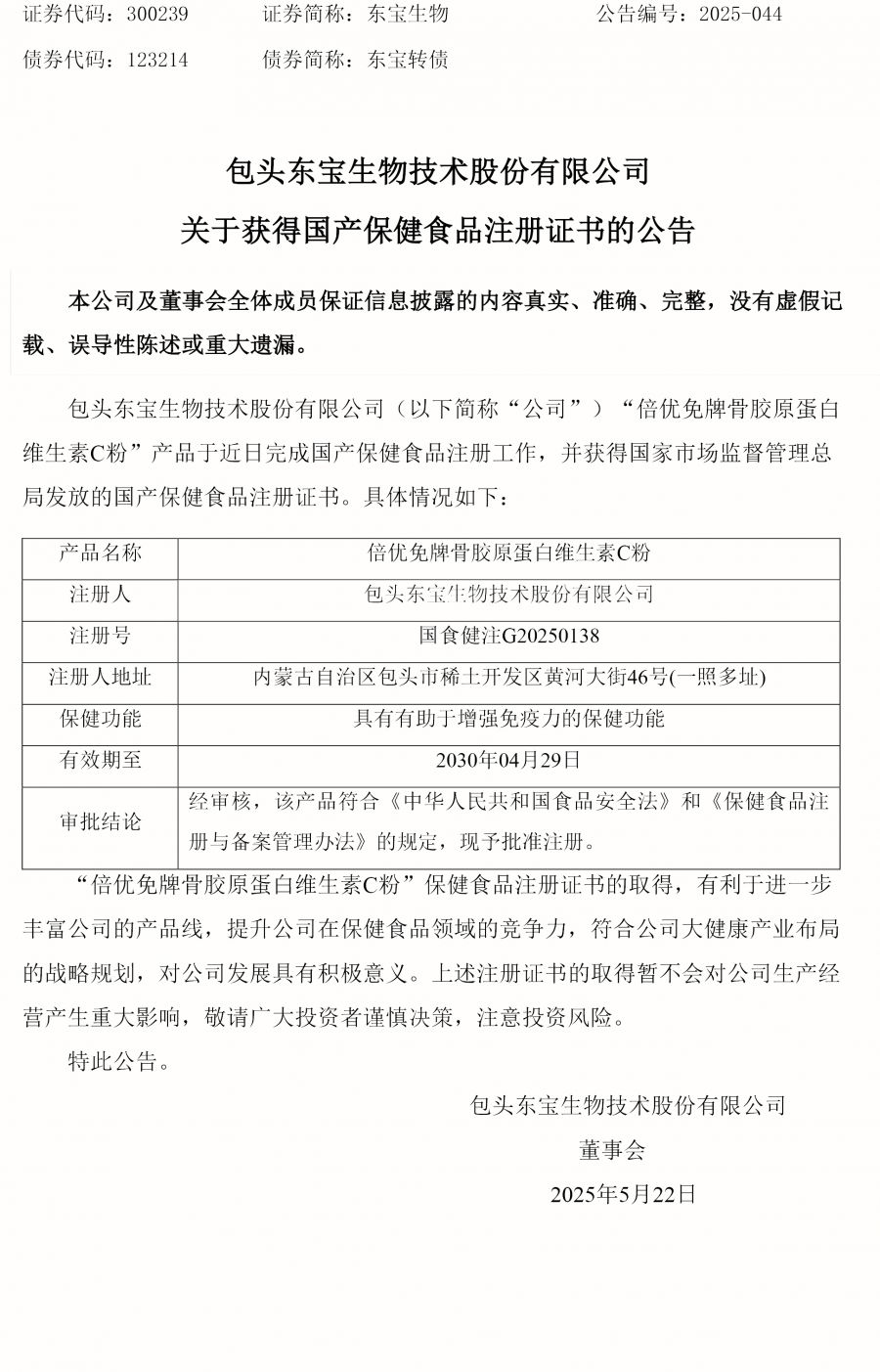 包頭東寶生物技術股份有限公司關于獲得國產保健食品注冊證書的公告